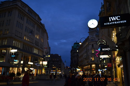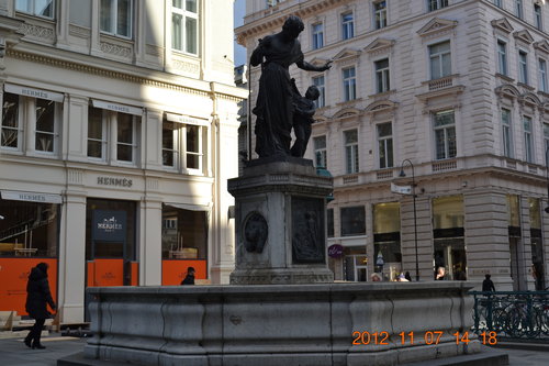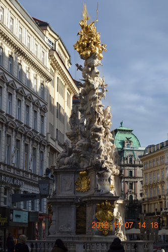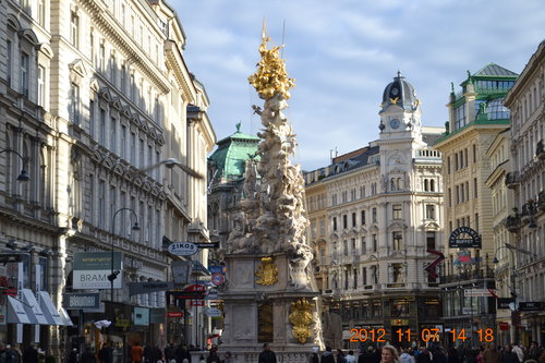 2012年我們捷克、斯洛伐克、匈牙利、奧地利12日旅遊,漸漸進入尾聲,11月7日下午在奧地利首都維也納,看過維也納霍夫堡宮(Hofburg),來到精品區逛街,領隊阿哲在街道上簡單做口頭介紹,約定時間,放我們自行去逛街,好多精品店,且待我們逐家慢慢欣賞、品鑑。葛拉本 (Graben) 大道的中央,看到黑死病紀念柱(Pestsäule) ,為逃過黑死病這一劫而建,碑文意在提醒世人,不要忘記上帝給這座風花雪月的城市所帶來的懲罰。 1679年時黑死病蔓延時,皇帝雷翁波特一世發願,如果維也納人能逃過此劫就要奉獻。