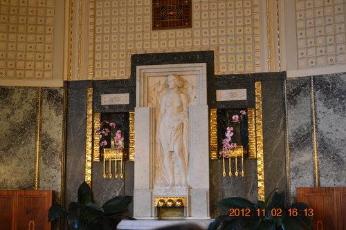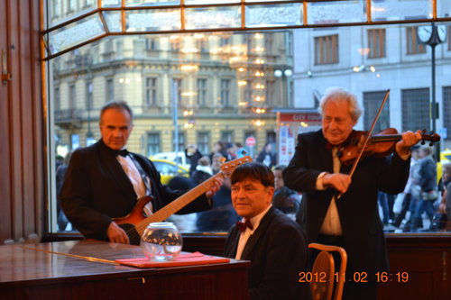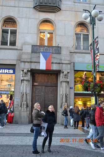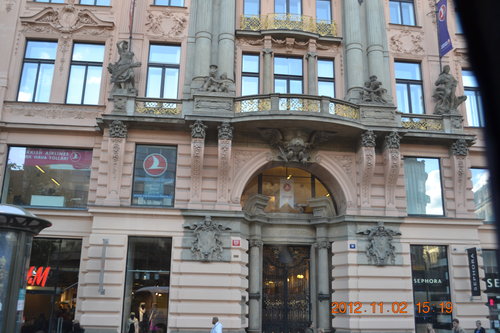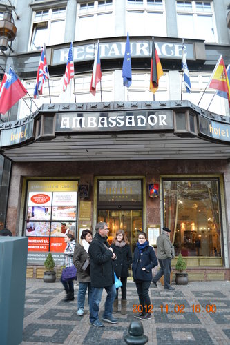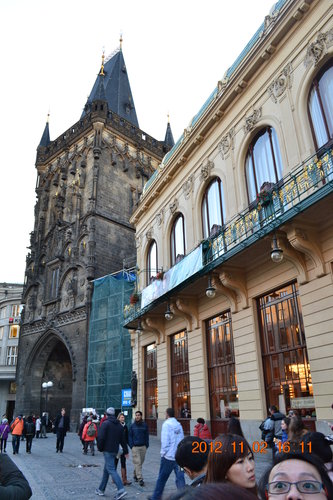 隨著城市在老城牆之外的增長,除了君主加冕的罕見情況外,火藥塔的重要性降低。到了17世紀,它被用作火藥儲存設施,因此而得名。不幸的是,在1757年,布拉格被普魯士人佔領時,城門被嚴重焚毀。到19世紀70年代和80年代,城門終於恢復其昔日的輝煌,現在是舊城牆唯一倖存的城門。2012年11月2日下午4點多,領隊阿哲帶我們到火藥塔旁市民會館的一樓Kavarna Obecni dum咖啡館享用一份悠閒的下午茶,一人一份蛋糕,一杯咖啡或果汁,休息一下,喘口氣。
