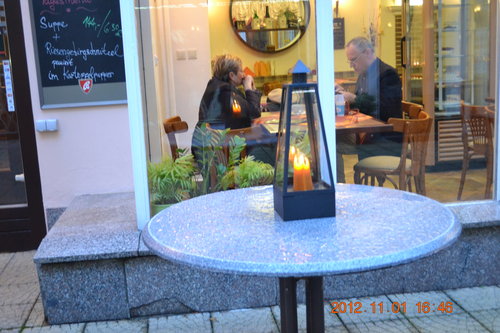 瑪麗安斯基 一對老人家在餐廳內用餐,蠟燭放在室外桌上。