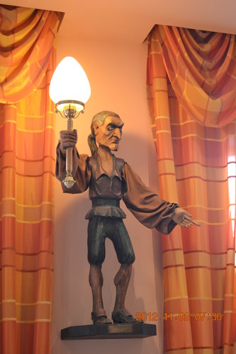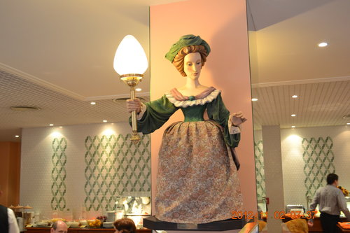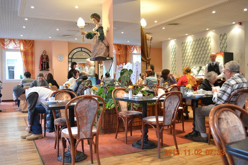 瑪麗安斯基 飯店餐廳,領隊阿哲低頭繫緊鞋帶,又要上路繼續今天行程。