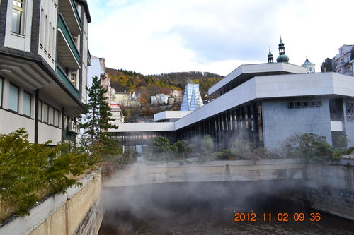 卡羅維瓦利 溫泉排放到水溝,冒出白煙。