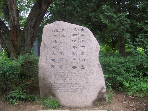 「白頭山石磨刀盡,豆滿江水飲馬無,男兒二十年未平國,後世誰稱大丈夫」。