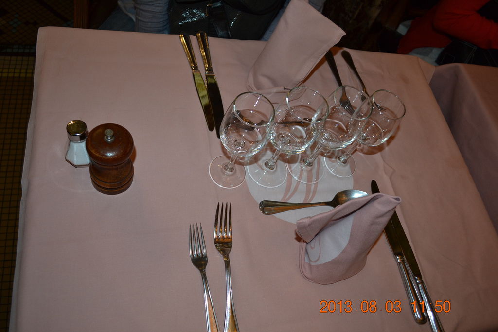 巴黎餐廳桌子上酒杯、刀叉等,