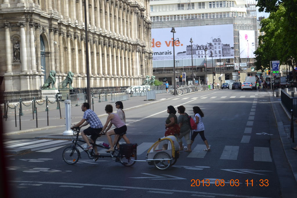 巴黎街頭有一對夫妻共騎協力車,