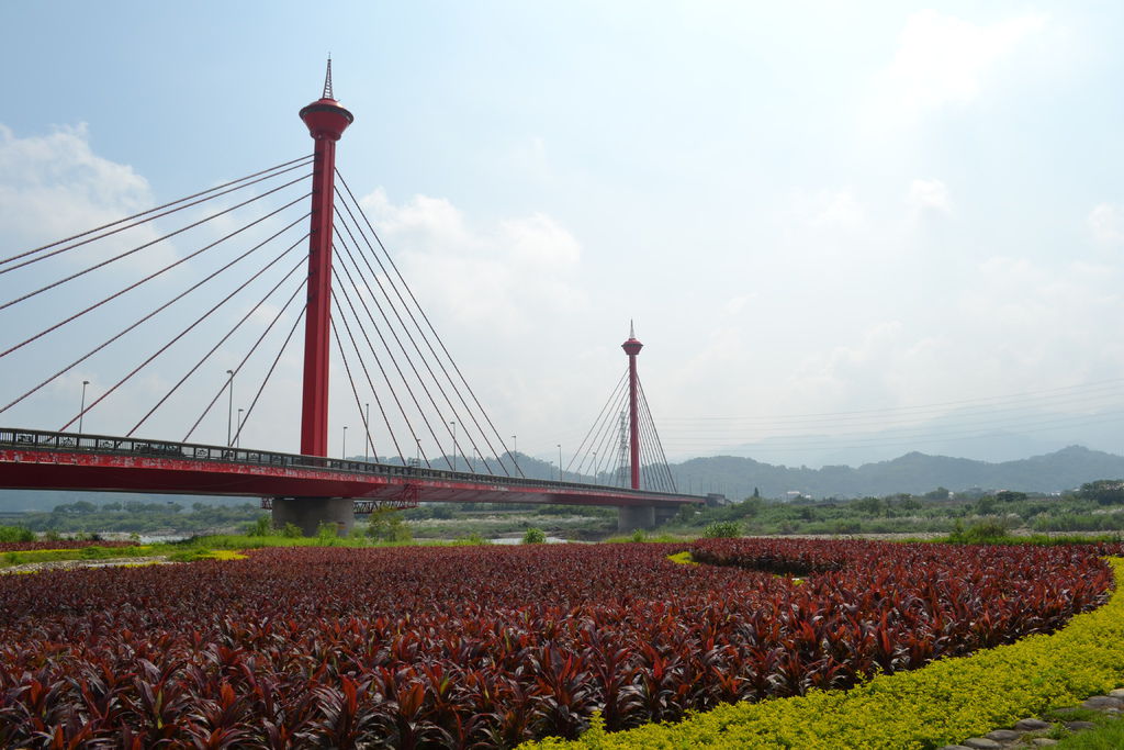夜間橋上會閃起五顏六色的燈光,頗有情人約會的氣氛,燈光美氣氛佳。橋下種植許多花草。