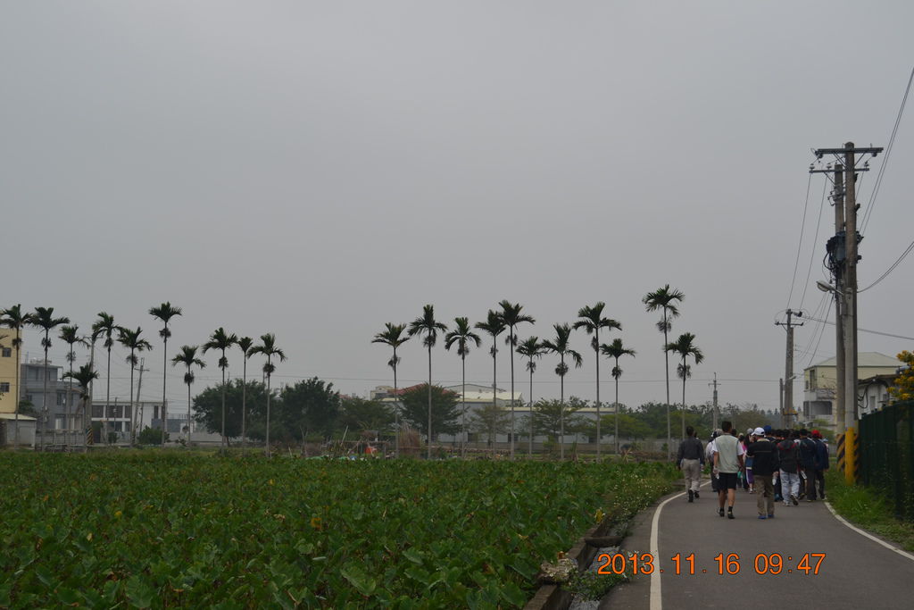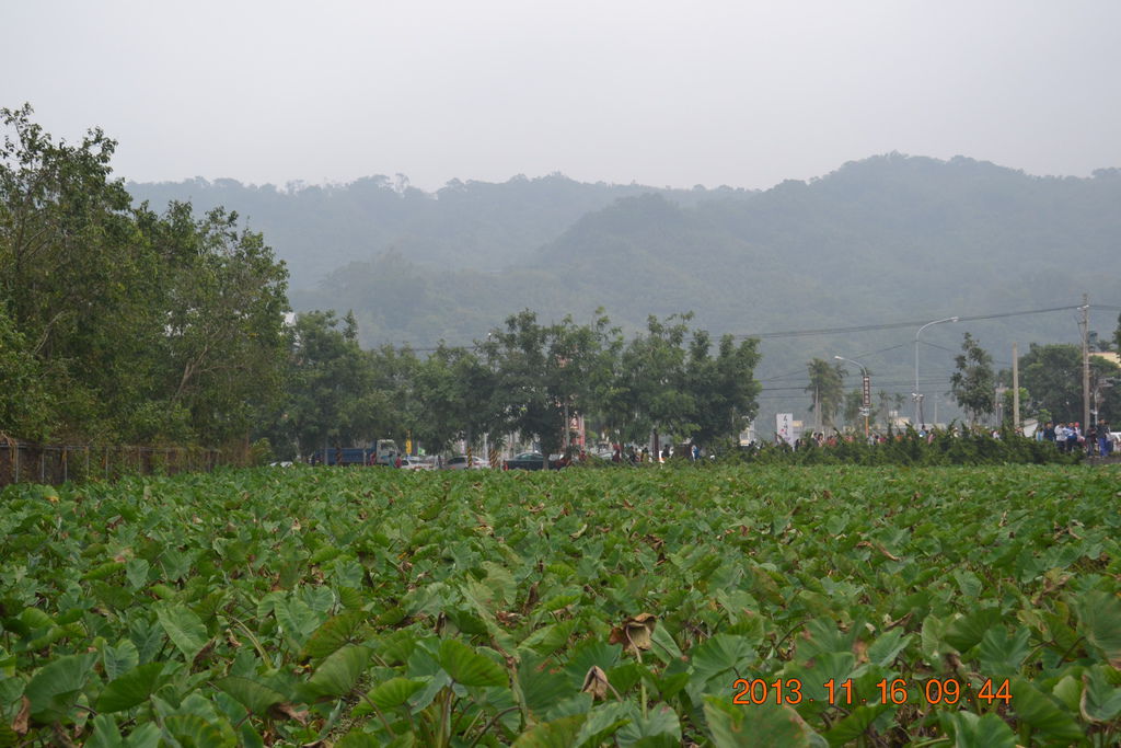 縣府員工健行在公館黃金小徑上,路旁有芋頭園區