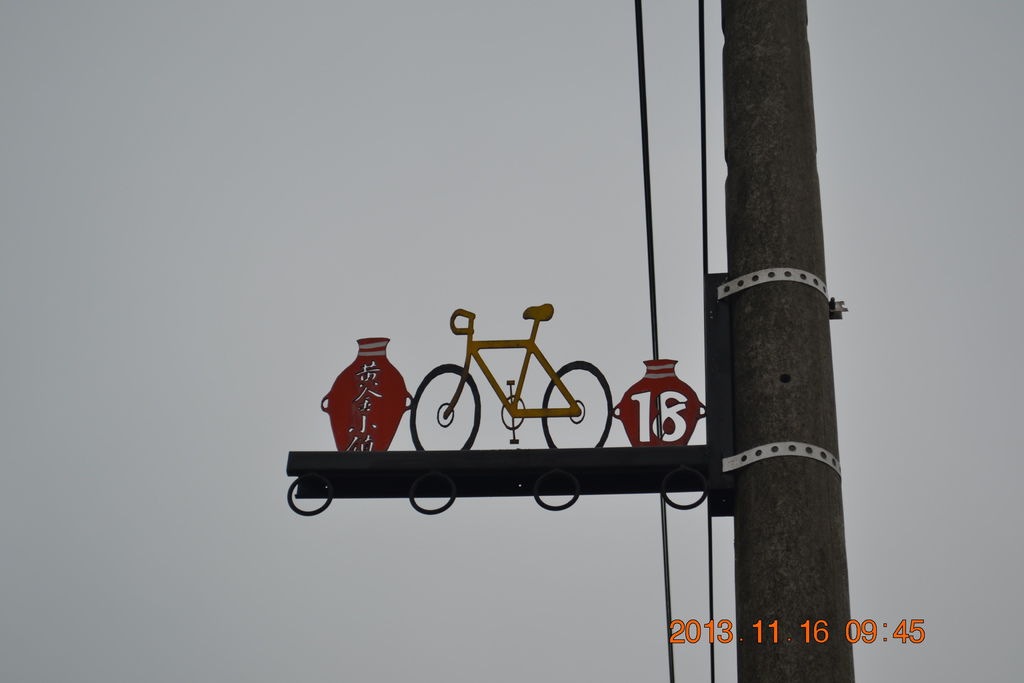 路旁電線桿上懸掛一迷你鐵馬,寫上黃金小鎮,很有特色。