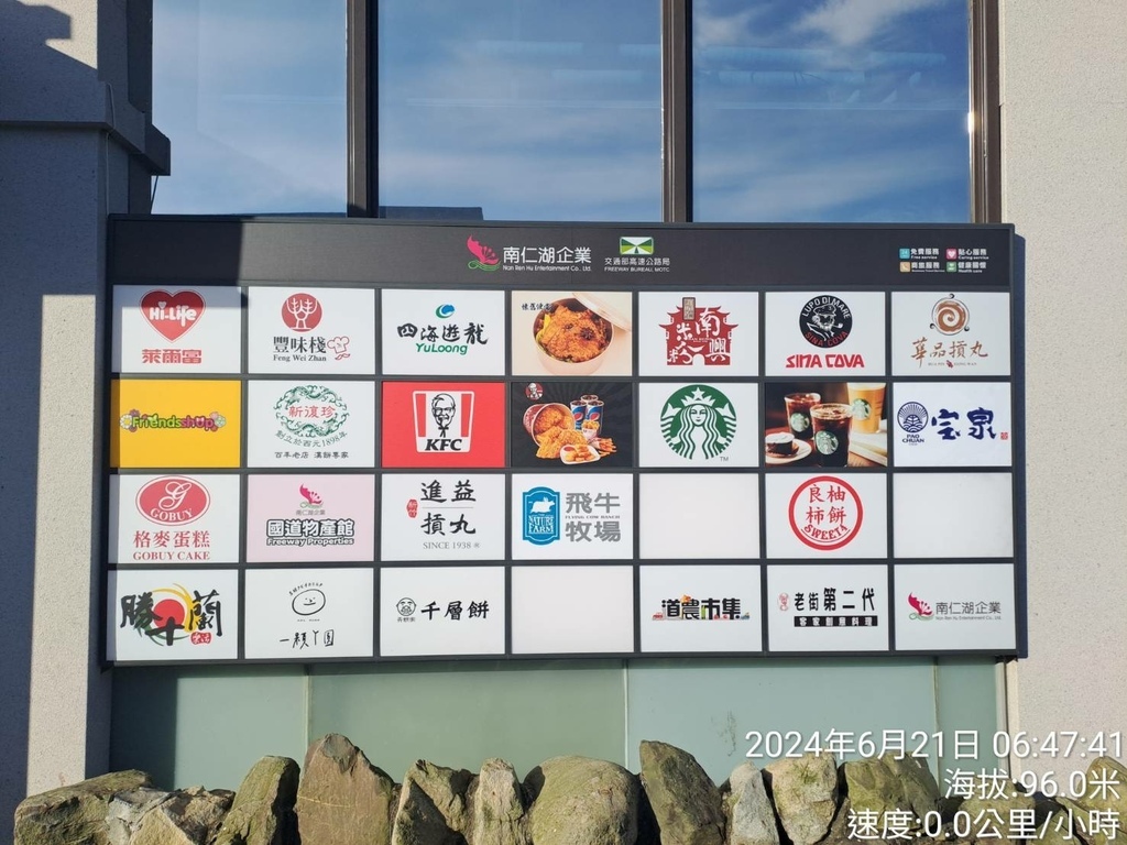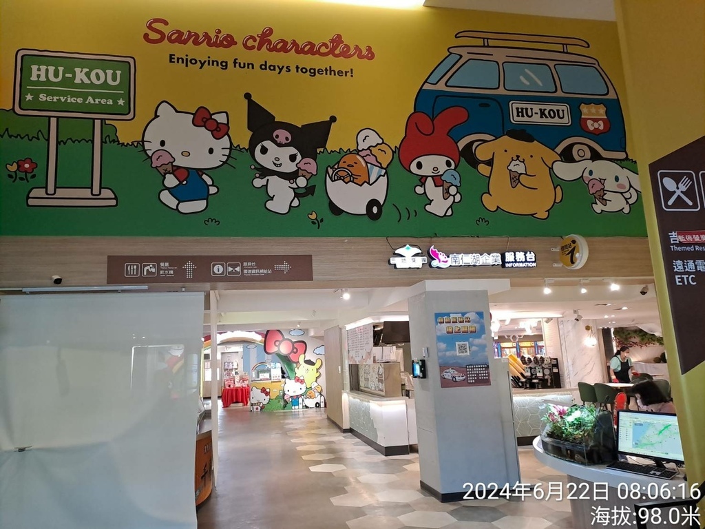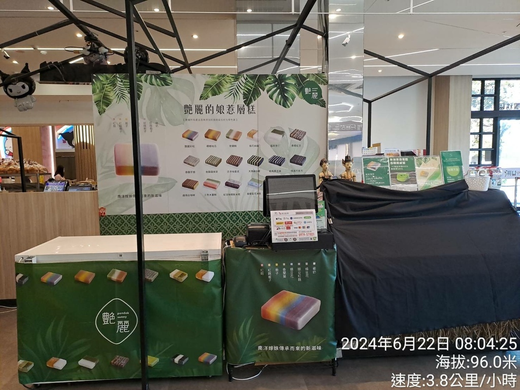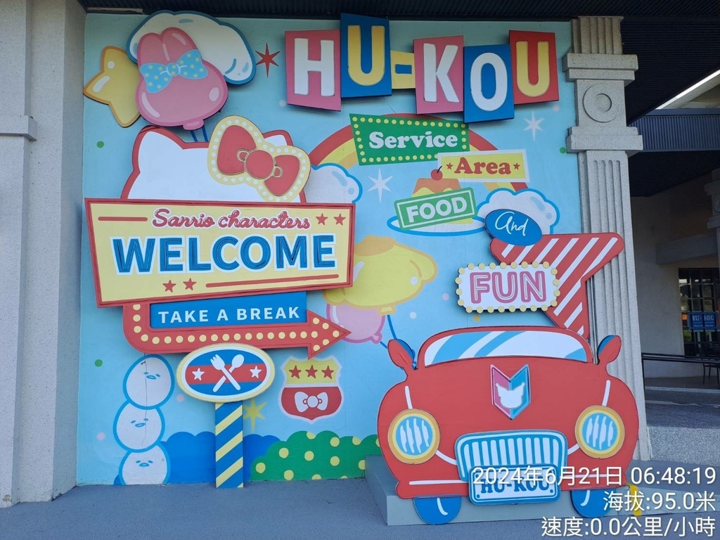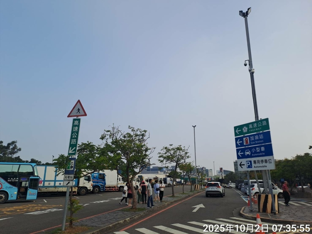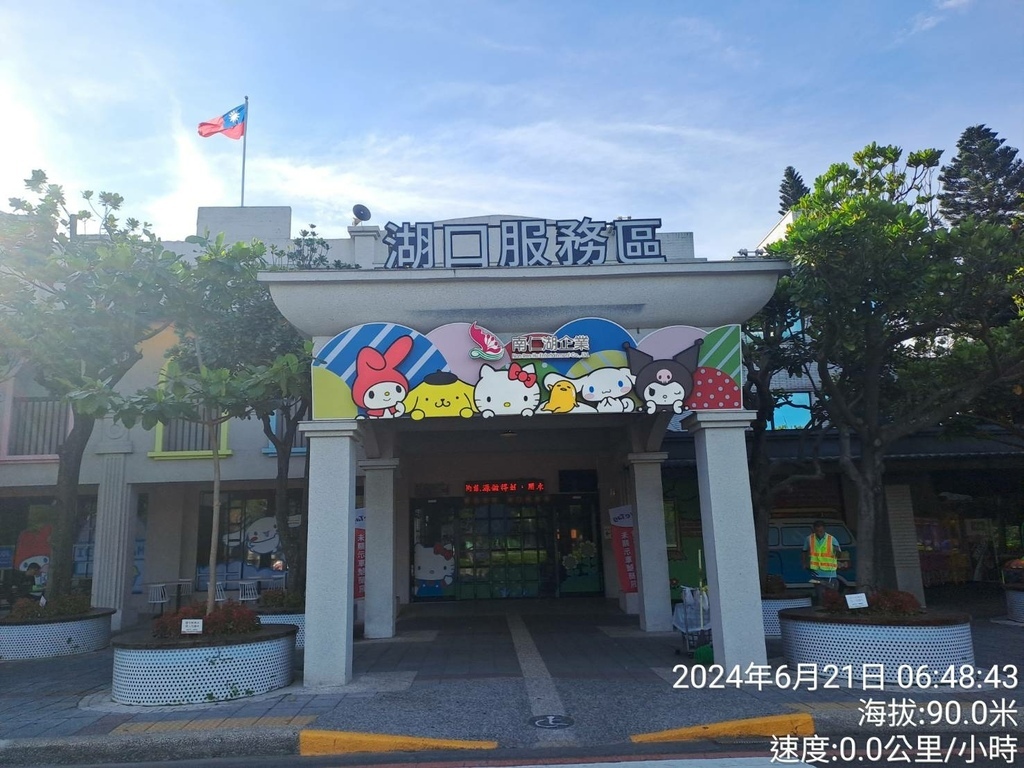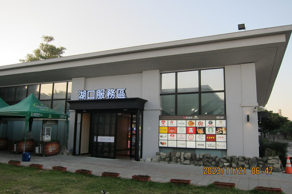 大嬸婆在湖口服務區大門口頭戴斗笠,