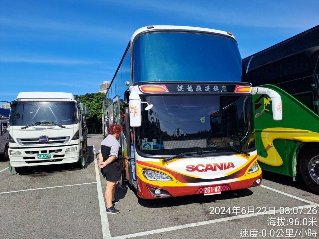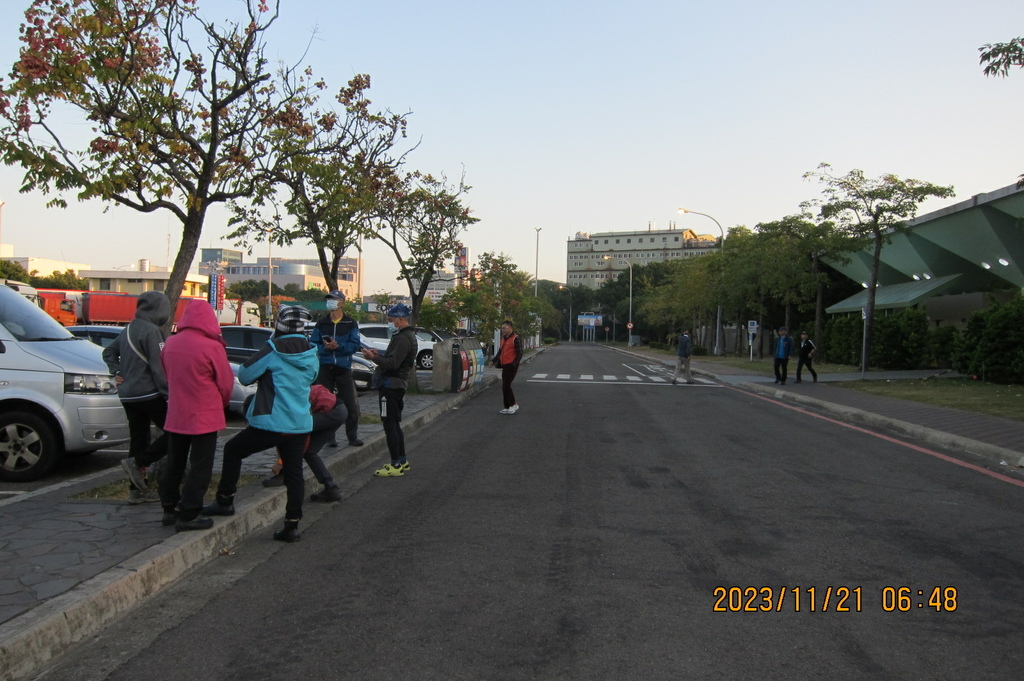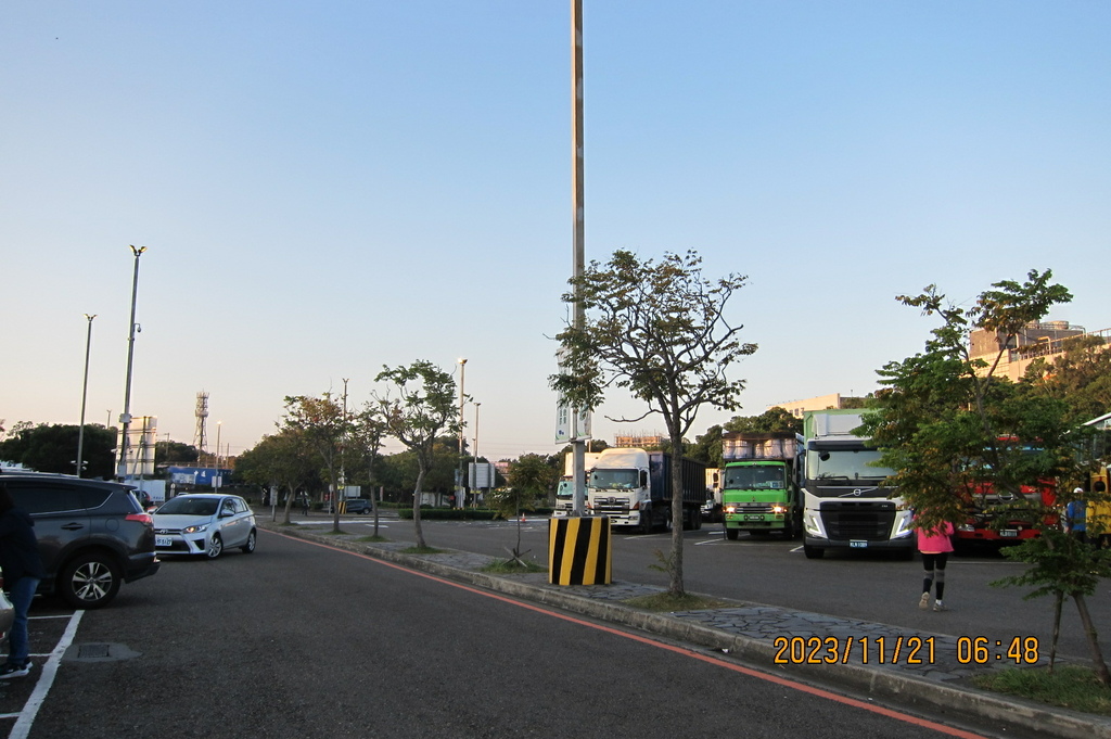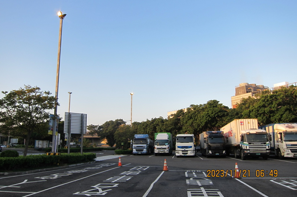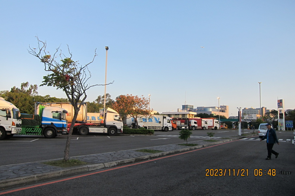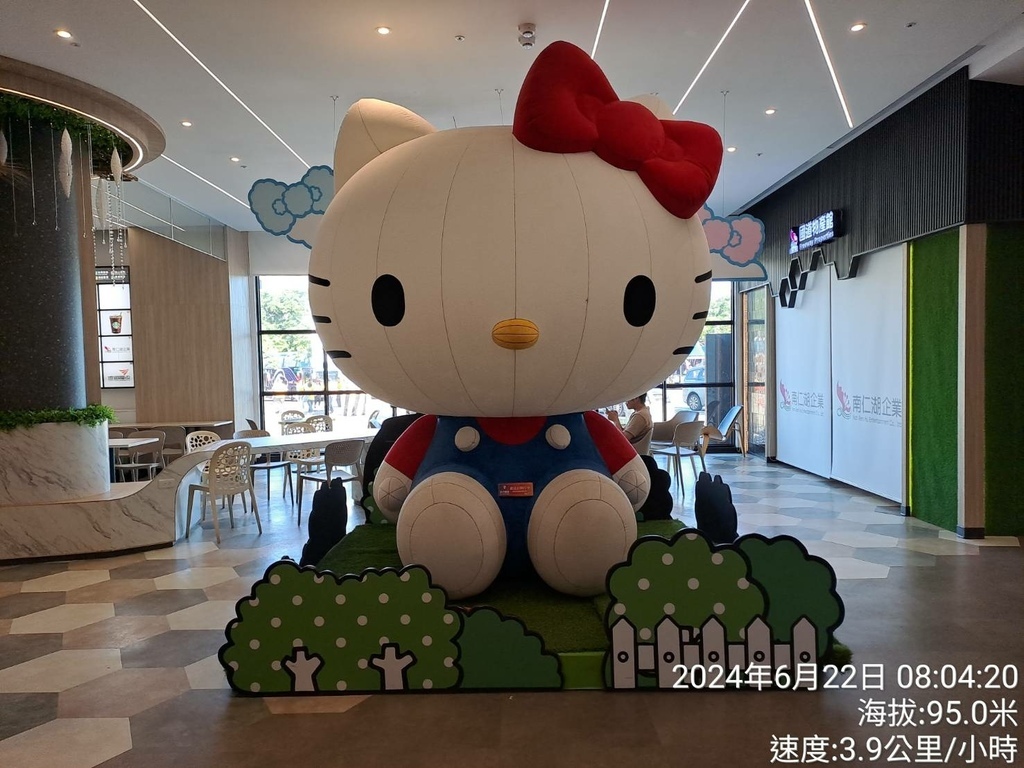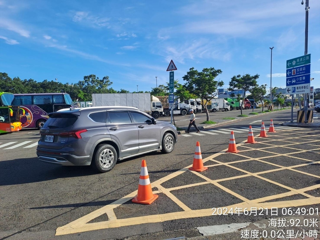 大嬸婆在湖口服務區大門口頭戴斗笠,