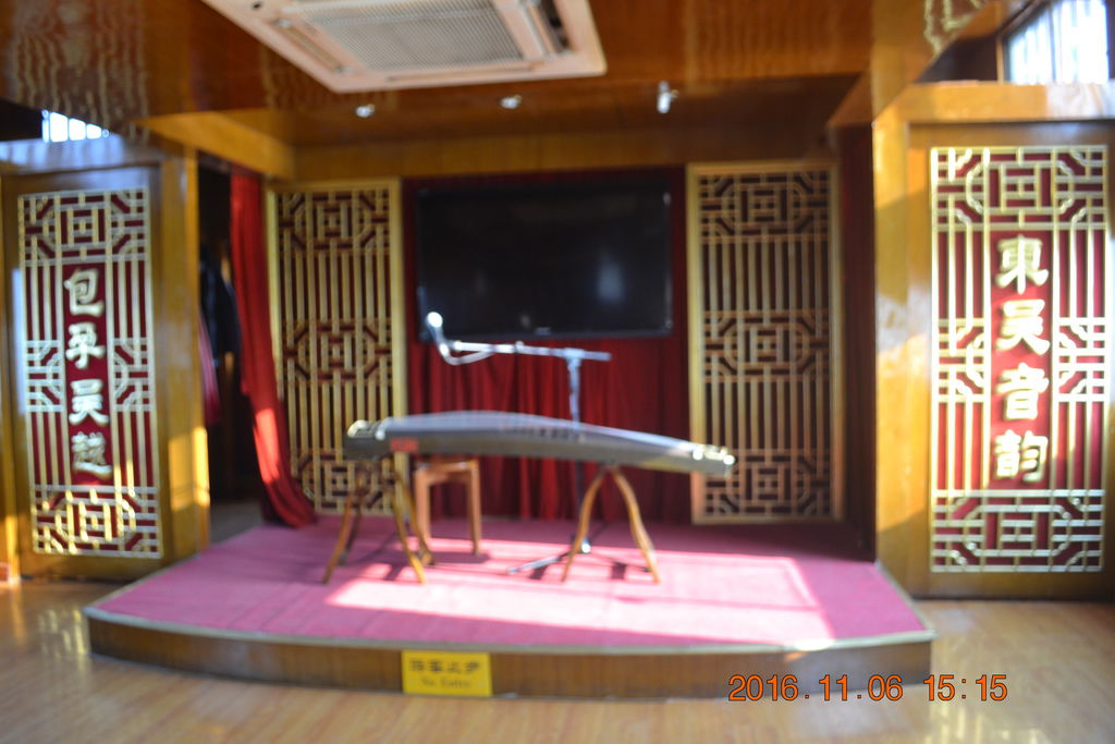船上有古裝美女彈奏古箏。