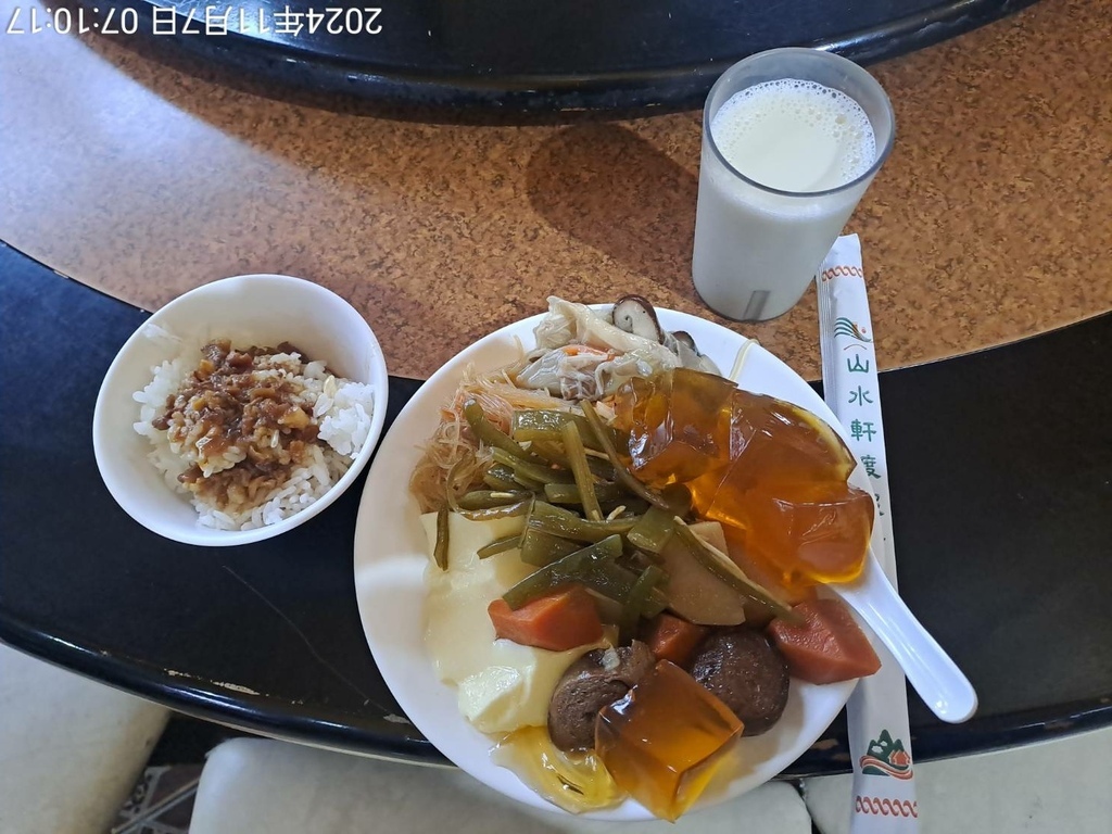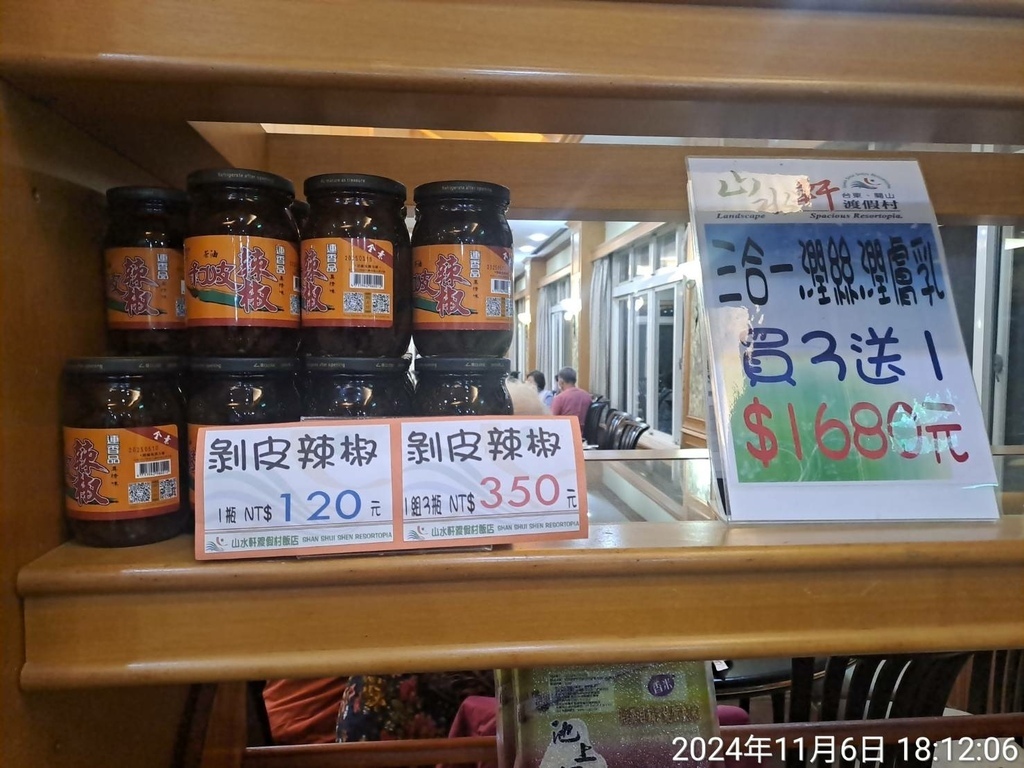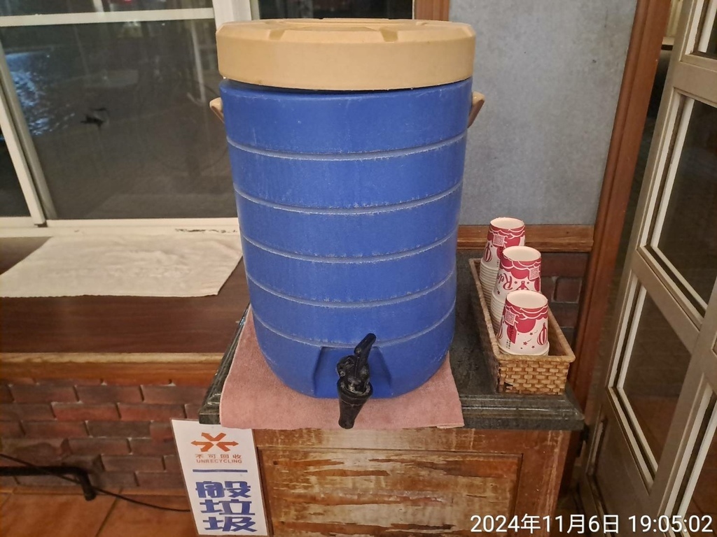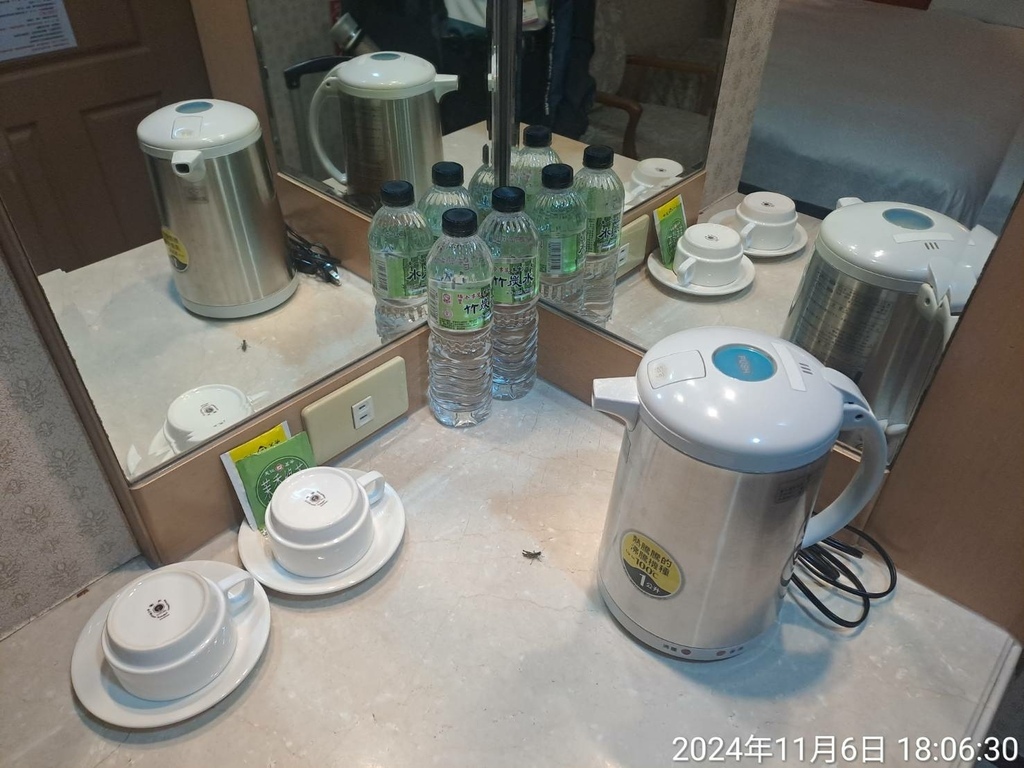 有瓶裝水、茶包、茶杯及溫水瓶等,