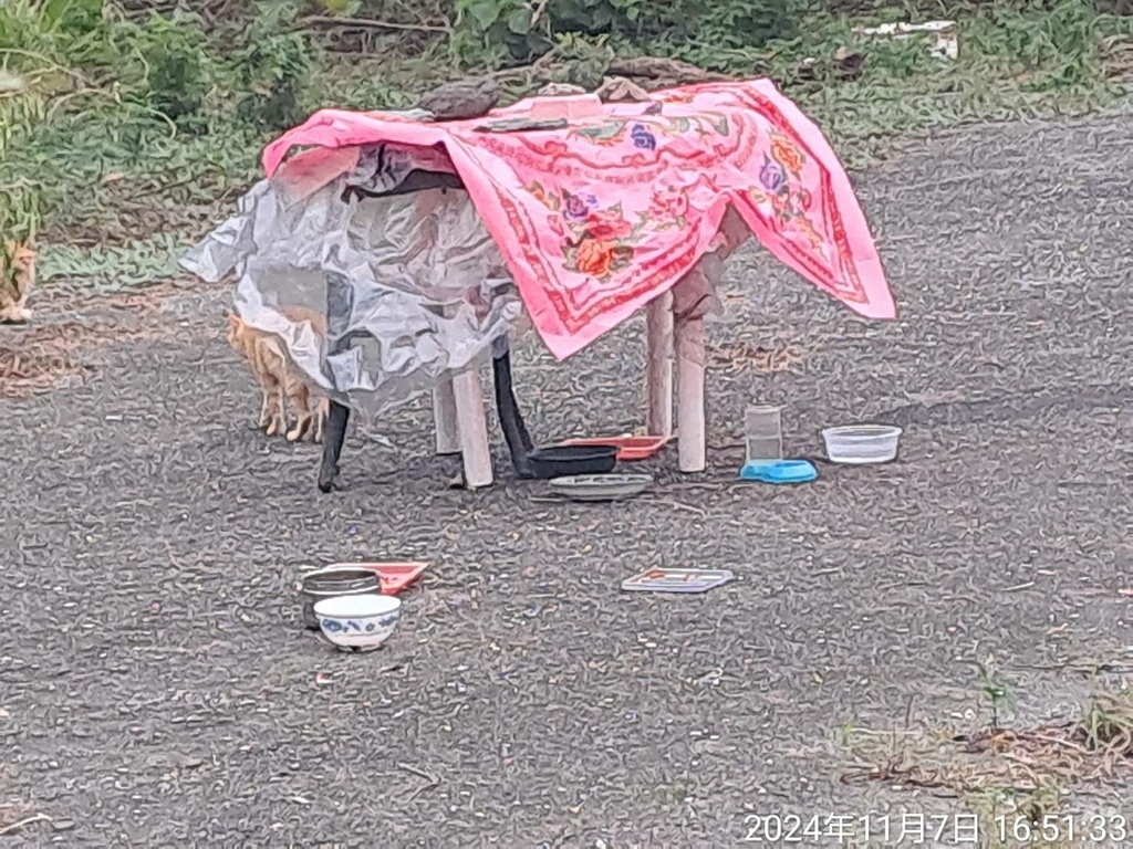 樹蔭下有盛裝飼料碗盤等,