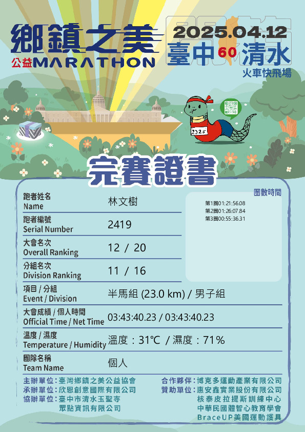 四、半馬組,23.0公里,2B1A,4.4K*2(來回)*2圈、2.7K*2(來回)*1圈,06:00起跑,限時4小時。